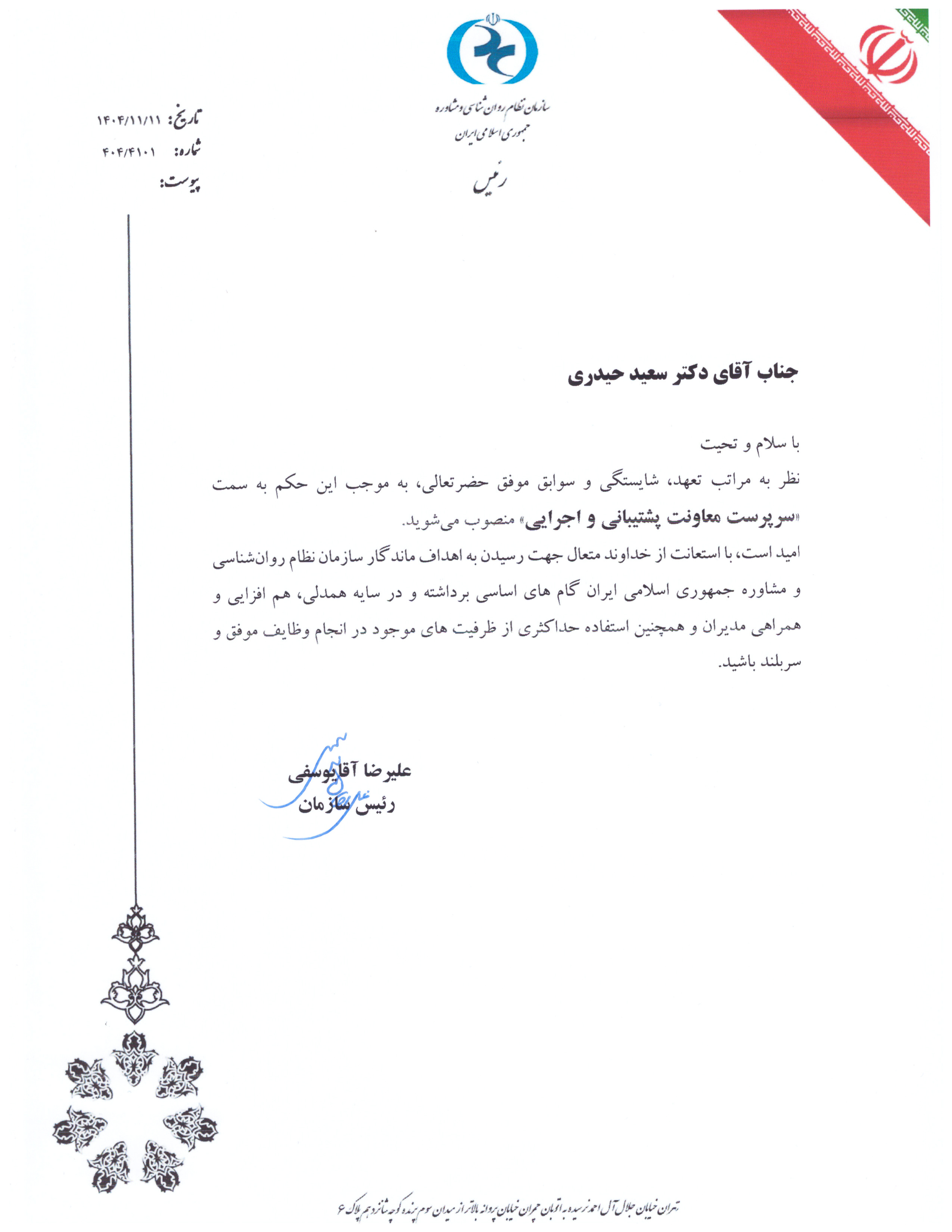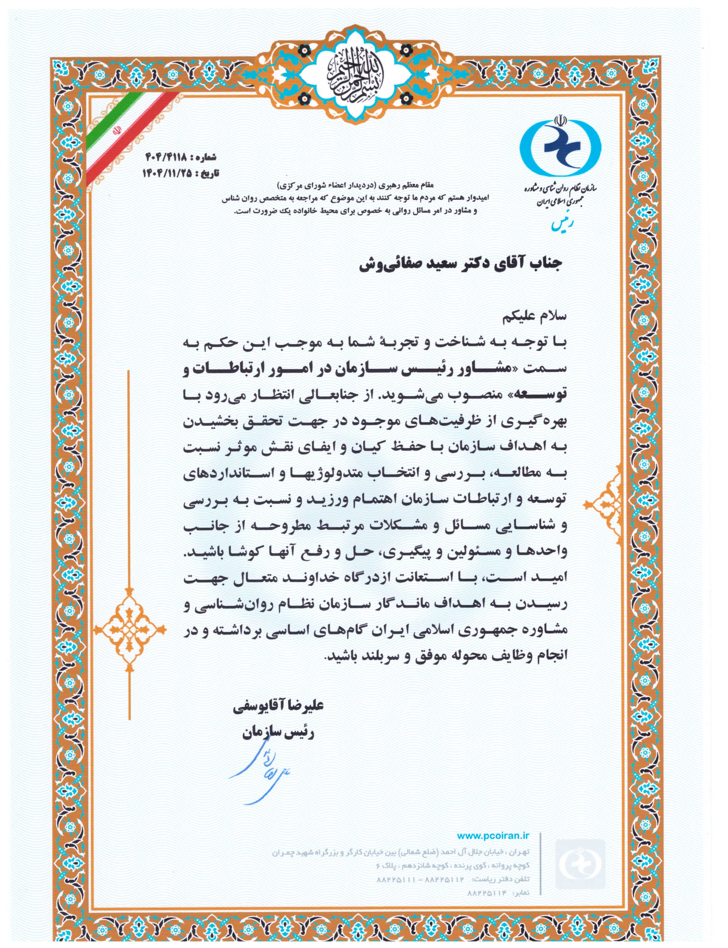دکتر سعید صفائیوش به عنوان مشاور رئیس سازمان در امور ارتباطات و توسعه،