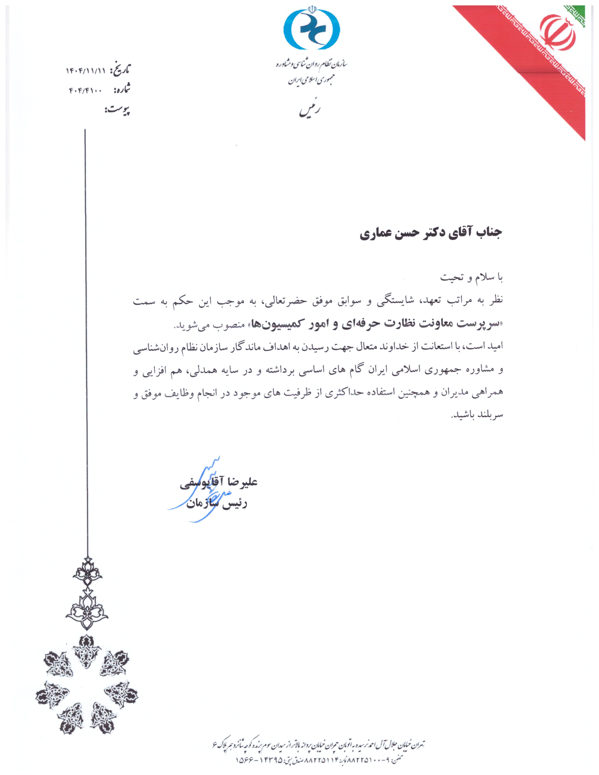 دکتر حسن عماری به عنوان سرپرست معاونت نظارت حرفهای و امور کمیسیونها،