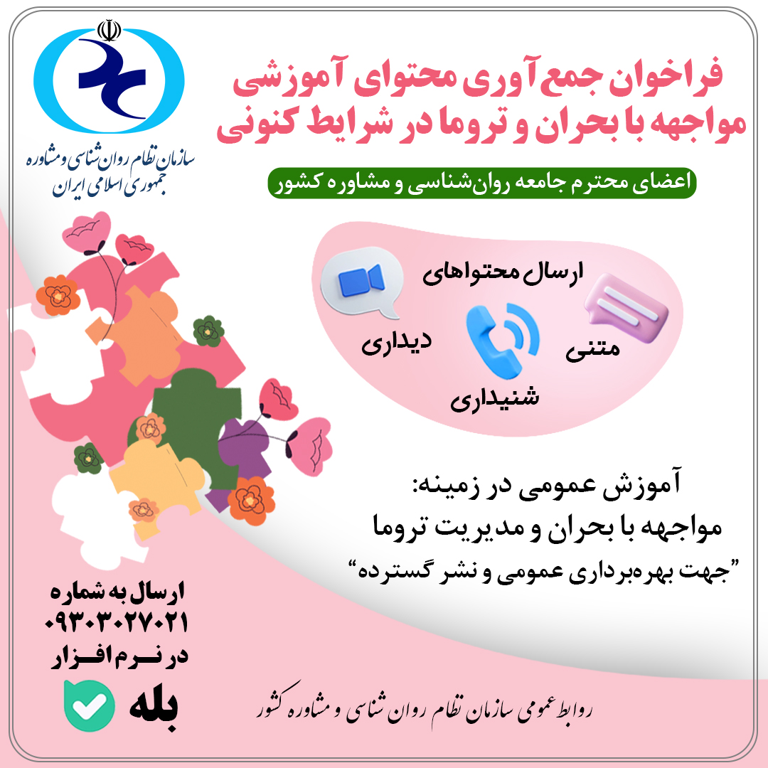 با عنایت به شرایط حساس کنونی و فشارهای روانی ناشی از بمبارانهای گسترده دشمن، از تمامی روانشناسان و مشاوران ارجمند دعوت به عمل میآورد تا در راستای تقویت تابآوری روانی جامعه و ارائه خدمات حمایتی مؤثر برای عموم مردم، محتواهای متنی، دیداری و شنیداری خود را در راستای آموزش عمومی در زمینه "مواجهه با بحران" و "مدیریت تروما" در اسرع وقت، جهت بهرهبرداری عمومی و نشر گسترده، به شمارهی 09303027021 در نرمافزار بله ارسال فرمایید.