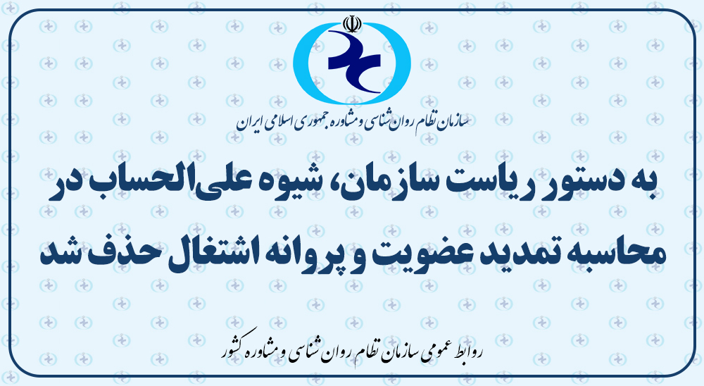 به گزارش روابط عمومی، با دستور دکتر علیرضا آقایوسفی، رئیس سازمان نظام روانشناسی و مشاوره، از این پس در فرآیند تمدید عضویت و پروانه اشتغال، هیچگونه هزینهای بابت مابهالتفاوت سالهای گذشته از اعضا دریافت نخواهد شد.