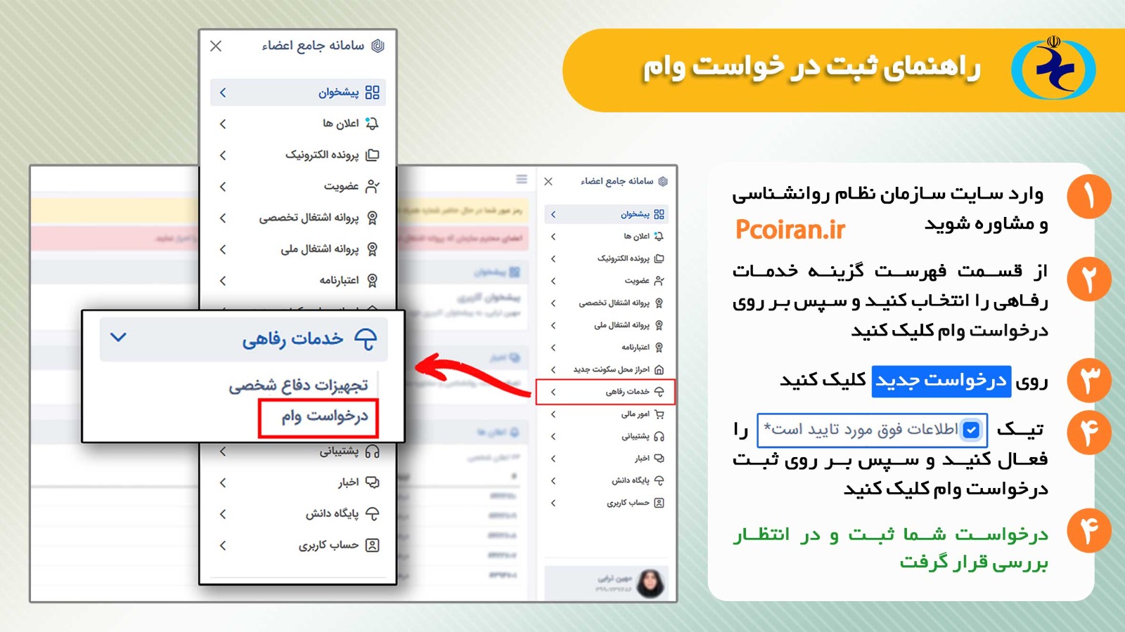 متقاضیان محترم میتوانند جهت شرکت در این قرعهکشی و بهرهمندی از این تسهیلات رفاهی، از ساعت ۸ صبح روز شنبه ۲۹ فروردینماه ۱۴۰۵ تا پایان روز دوشنبه ۷ اردیبهشتماه ۱۴۰۵ با مراجعه به سامانه جامع مدیریت اعضای سازمان (https://my.pcoiran.ir/panel/login/) و ورود به بخش «خدمات رفاهی» در پنل خود، فرآیند ثبتنام را تکمیل نمایند.