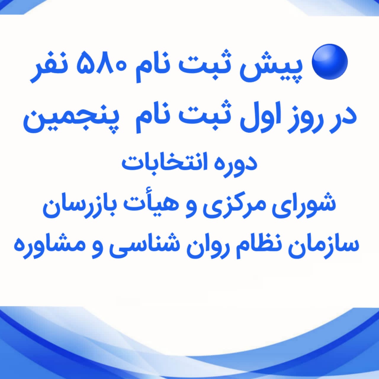 - پیش ثبت نام ۵۸۰ نفر در روز اول ثبت نام پنجمین دوره انتخابات شورای مرکزی و هیأت بازرسان سازمان نظام روان شناسی و مشاوره ج.ا.ا
