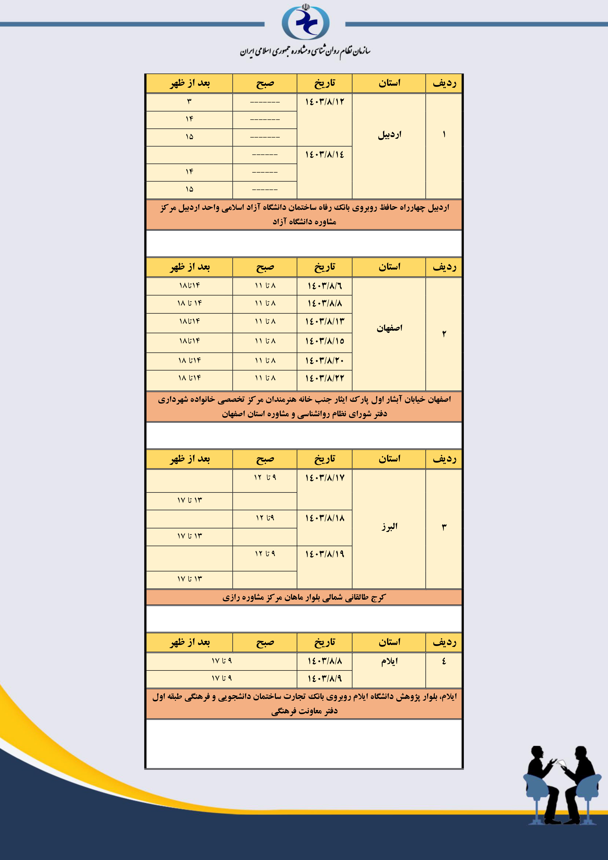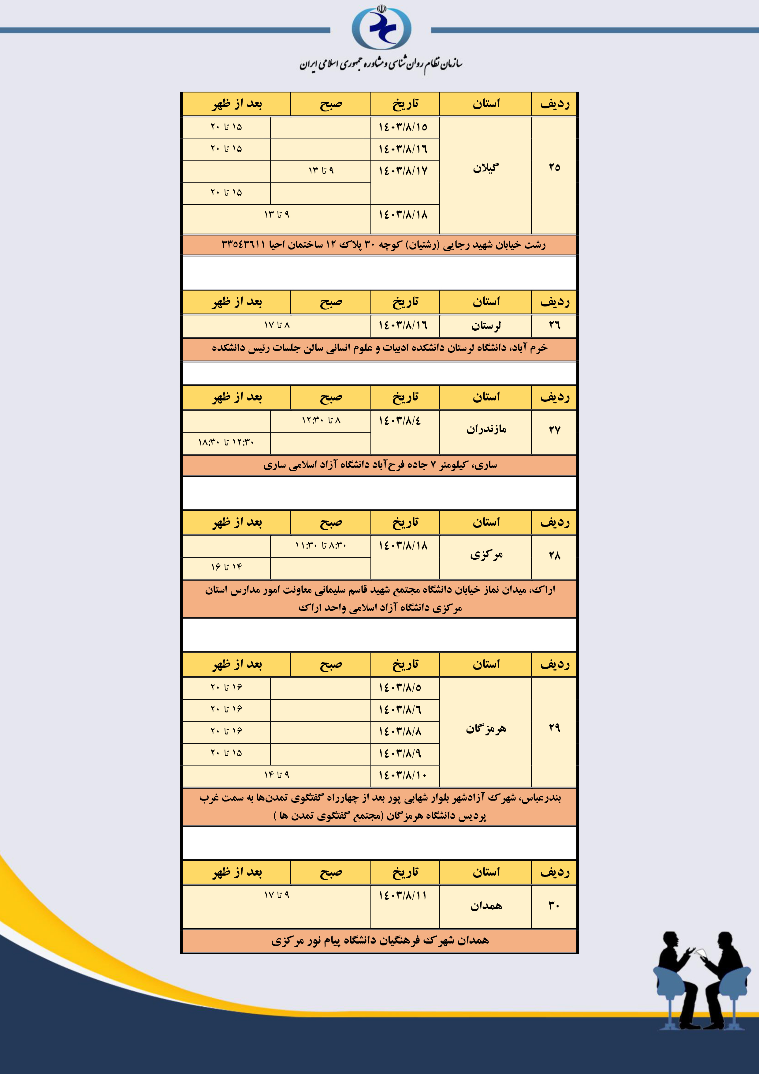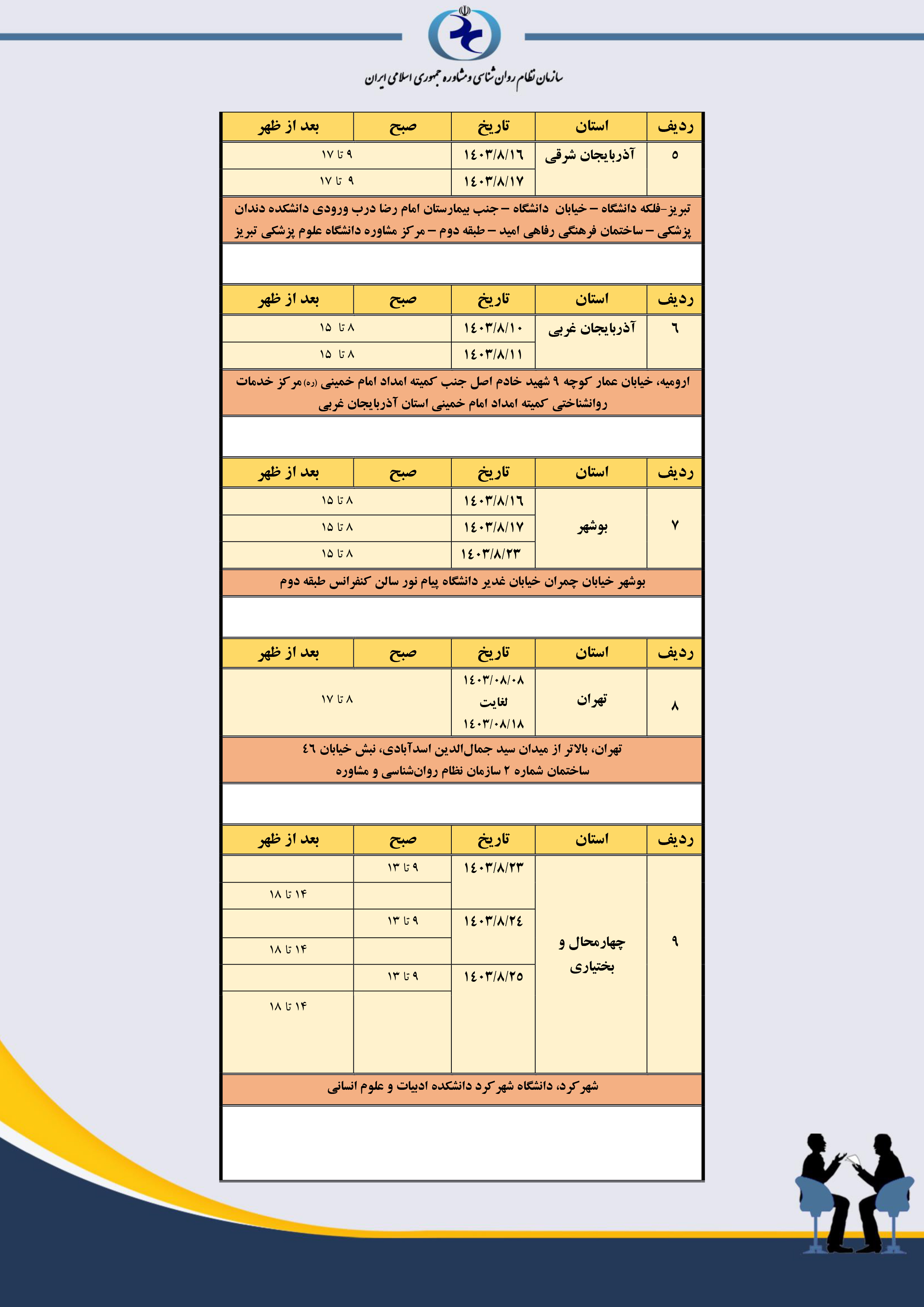 جدول مکان و زمانبندی مصاحبه استانهای سراسر کشور