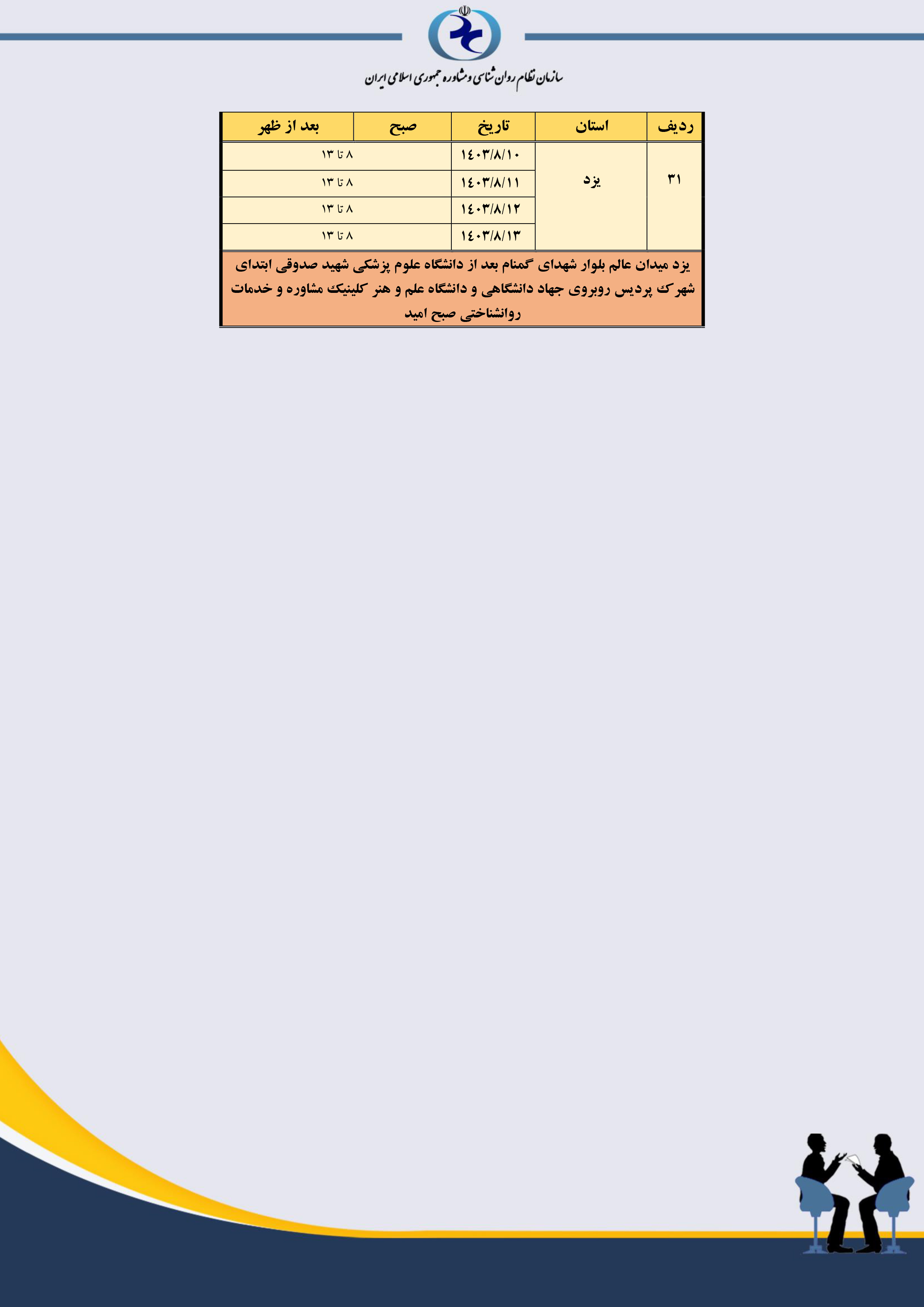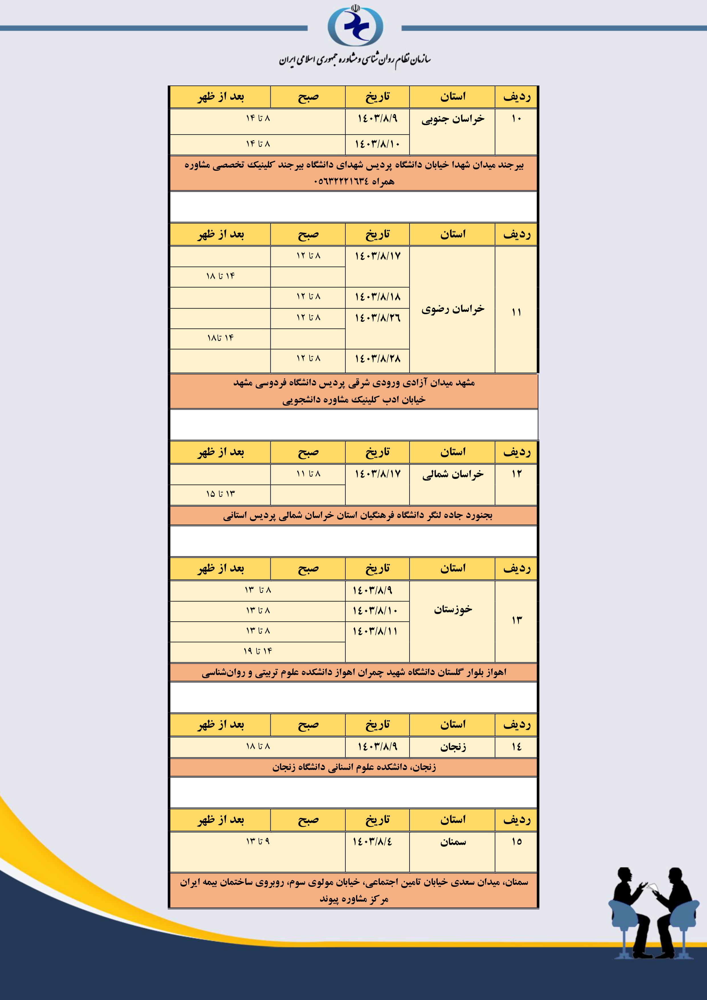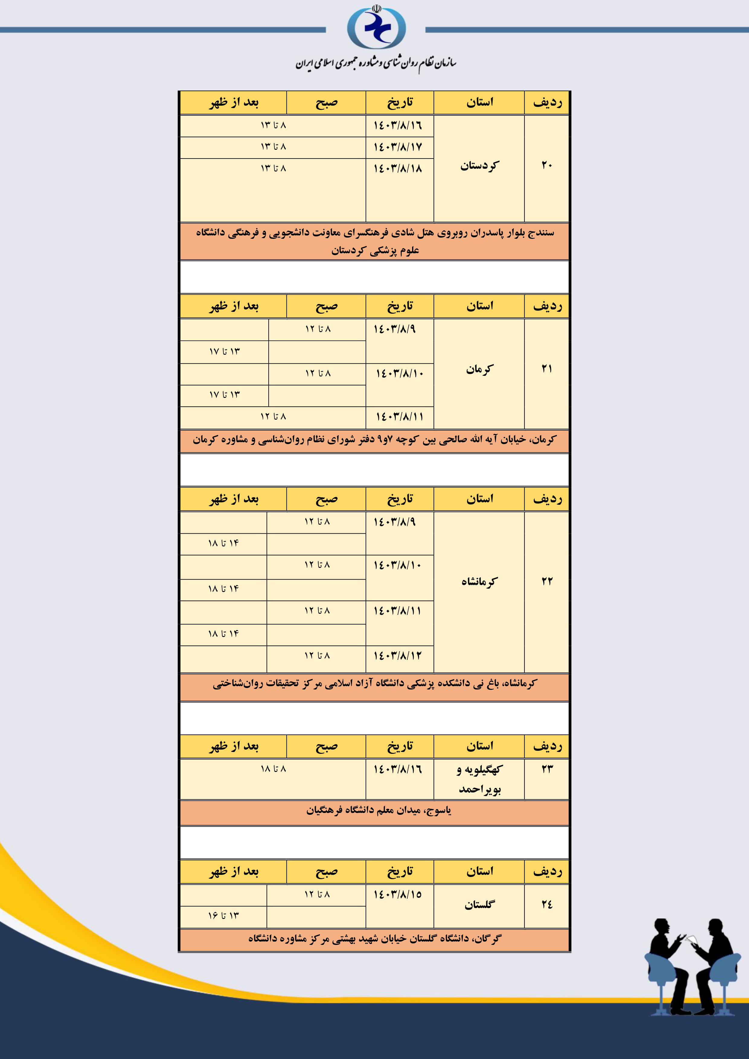 جدول مکان و زمانبندی مصاحبه استانهای سراسر کشور